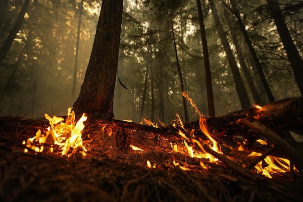 A hot spot from the Lower East Adams Lake wildfire burns in Scotch Creek, B.C., on Aug. 20, 2023.DARRYL DYCK/The Canadian Press