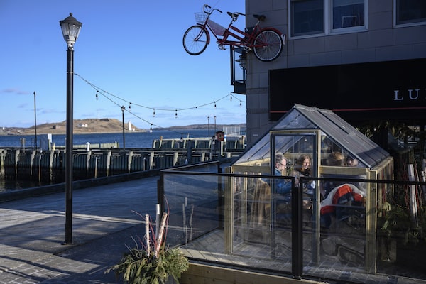 Diners eat in a shelter meant to curb the spread of COVID-19 at a restaurant on the waterfront in Halifax on March 16, 2021.Darren Calabrese/The Globe and Mail