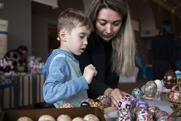Roxanne Zalucky and Theo Horbal, 5, look at pysanky at the St. Joseph’s Ukrainian Church Easter Bazaar in Oakville, Ont., on April 12.Marta Iwanek/The Globe and Mail