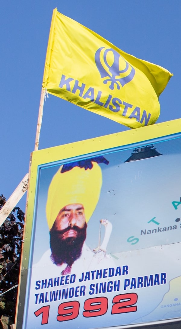 Inside the temple, photos of Indian discrimination and brutality are now paired with dozens of Khalistan flags. A portrait of the late Talwinder Singh Parmar – who two Canadian inquiries concluded was the mastermind of the Air India bombing, and who was killed by Indian police after fleeing Canada – hangs in the dining hall. He is also depicted on a massive billboard outside, along a major Surrey thoroughfare.