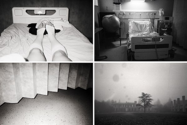 When Michelle went to the hospital in labour earlier than expected, she had to wear compression socks to avoid blood clots. Ibrahim was vigilant about her wearing them because she had been vaccinated for COVID-19 and faced a small risk of clotting. Curtains separated her from a shared ward filled with women in various stages of labour complications; noises from heartbeat monitors filled the ward each night. The skies over Cambridge, as seen from Michelle's home, were gloomy.Michelle Siu/The Globe and Mail