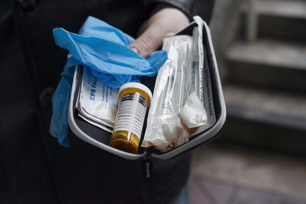 Garth Mullins holds a Naloxone anti-overdose kit in downtown Vancouver, on Feb. 10, 2017.JONATHAN HAYWARD/The Canadian Press