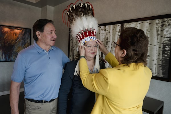 Loretta Woodhouse, mother of Assembly of First Nations National Chief Cindy Woodhouse, places her daughter's headdress on her head as Cindy's father, Garnet, looks on, in Montreal on July 8.Andrej Ivanov/The Globe and Mail
