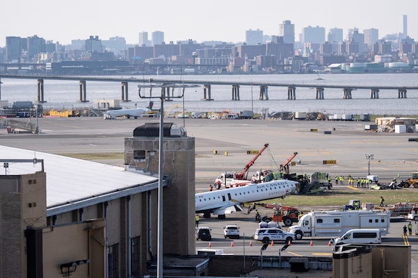 An airport maintenance crew moves the wreckage of the Air Canada Express jet from the runway at LaGuardia Airport in New York on Wednesday.Yuki Iwamura/The Associated Press