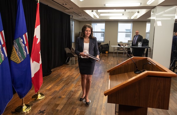 Alberta Premier Danielle Smith makes her way to the podium to introduce legislation addressing agreements between the federal government and provincial entities in Edmonton on April 10.JASON FRANSON/The Canadian Press