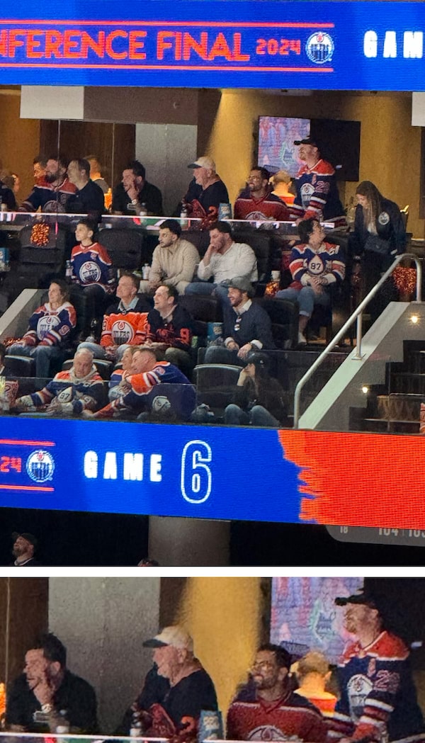 Mr. Mraiche, far left in detail, and Mr. Amery, far right, attended an Oilers game in the same suite on June 2, 2024, with the Premier and several members of her staff.
