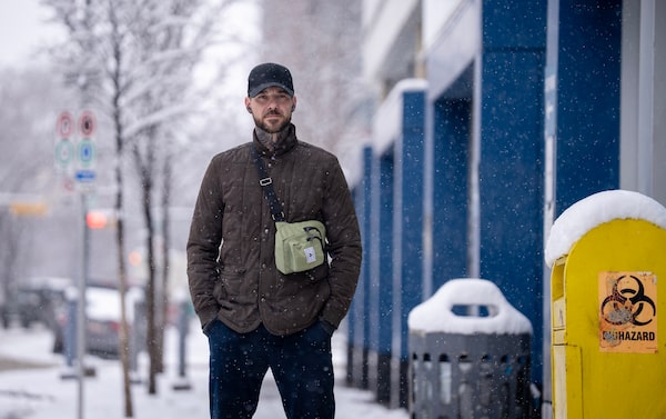 Travis Peddie, who has previously relied on supervised drug-use sites in Alberta, stands outside the shuttered site in Calgary on Thursday.Todd Korol/The Globe and Mail