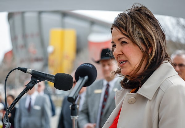 Alberta Premier Danielle Smith speaks at an announcement on plans for an events centre to replace the aging Saddledome in Calgary on April 25. Smith, a day after linking $330 million in provincial money for an NHL arena project to her United Conservatives getting re-elected, told reporters she hopes it doesn’t become an election issue.Jeff McIntosh/The Canadian Press