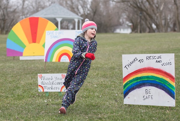 Five-year-old Edelweiss Aebi plays in a "Field of Thank Yous" in the Montreal suburb of Baie-D'Urfe, Sunday, April 26, 2020.Graham Hughes/The Canadian Press