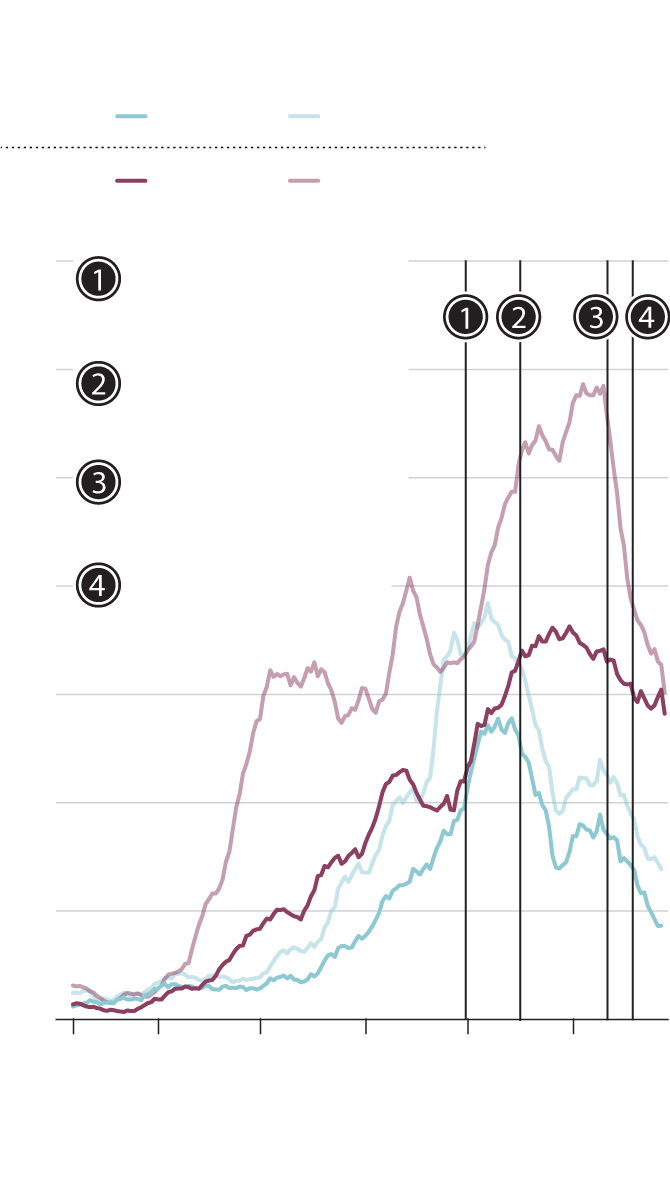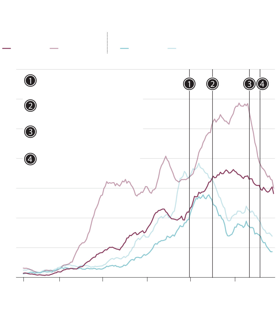 In Quebec, everyone between the ages of 10 and 60 saw a large spike in cases during the 25-to-32-day Christmas school break while cases among younger children stayed relatively stable, before the drop began. Albertans had a much smaller, temporary rise in holiday cases overall before a downward trend resumed.