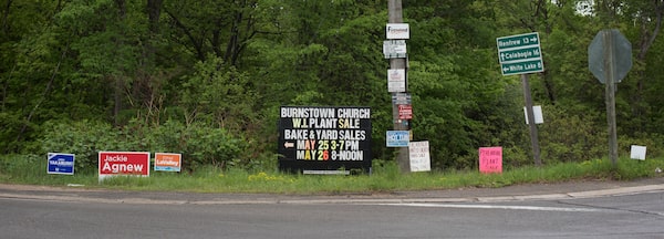 In Burnstown, Ont., at the corner of Calabogie Road and Burnstown Road, election signs jockey for attention alongside signs promoting plant and bake sales.Fred Lum/The Globe and Mail