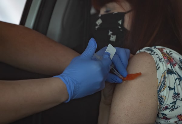 Nurse Virpal Sidhu reaches into a vehicle to administer the Moderna COVID-19 vaccine to Sharon Brock at a Fraser Health drive-thru vaccination site, in Coquitlam, B.C., on May 5, 2021.DARRYL DYCK/The Canadian Press