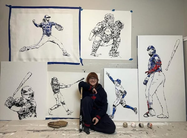 Samantha Woj, seen in this undated handout photo, uses baseball bats, balls and gloves to create paintings of iconic Toronto Blue Jays moments.HO/The Canadian Press