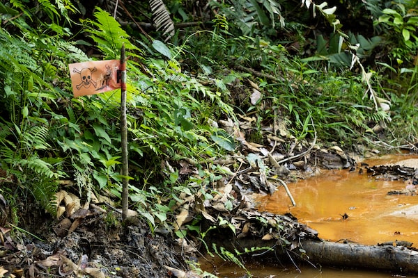 A red flag in the Huayuri creek, within the Achuar territory of Peru’s Amazon, marks a site impacted by an oil spill. Indigenous officials say their communities should be consulted on work to clean up contamination and aging infrastructurePatrick Murayari/The Globe and Mail