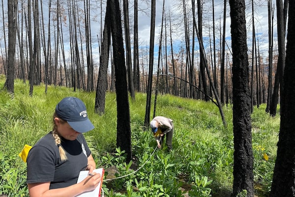 TRU grad student Natalie Maslowski establishes a plot at Beaver Valley this past July to measure the regeneration from repeat wildfires.Nicola Costerton/Courtesy of Jill Harvey