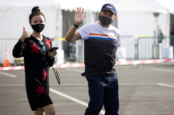 People gestures while exiting a Disneyland parking lot after receiving a dose of the Moderna COVID-19 vaccine at a mass vaccination site in Anaheim, Calif., on Jan. 13, 2021.MARIO ANZUONI/Reuters