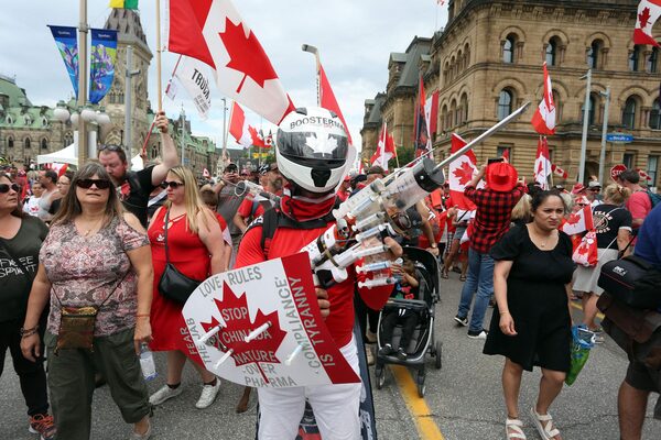 A man with a giant syringe marches in Ottawa this past Canada Day, when protesters returned to a downtown core that had been occupied months earlier by truck convoys promoting anti-vaccine misinformation.DAVE CHAN/AFP via Getty Images