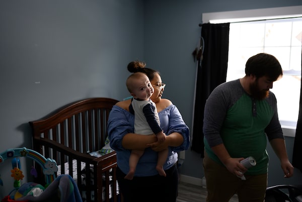 Carmen Barlow, centre, and Billy Pratt wake their 8-month-old son Logan from his nap while preparing to go to the Moncton Hospital to retrieve Barlow's medical records at their home in Indian Island First Nation, N.B. on April 4, 2019.Darren Calabrese