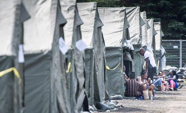 Aug. 15, 2017: Asylum seekers sit in front of their tents in a temporary camp in Saint-Bernard-de-Lacolle, Que.Paul Chiasson/The Canadian Press