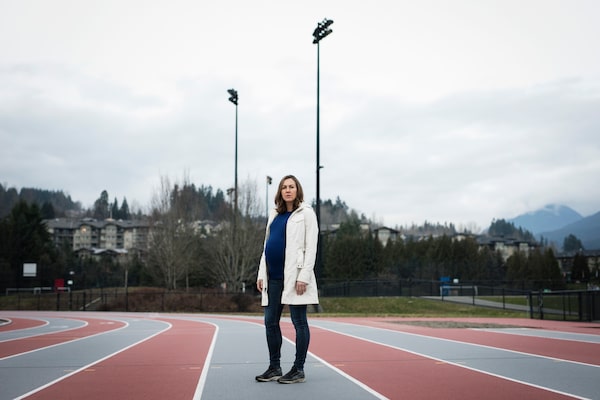 Megan Brown, shown at a stadium in Coquitlam, B.C., is a former student athlete who says her coach groomed her for a sexual relationship when she was a teenager. Now, she is speaking out against the power dynamics in a male-dominated running world in which predatory behaviour can go unchecked.Melissa Renwick/The Globe and Mail/The Globe and Mail