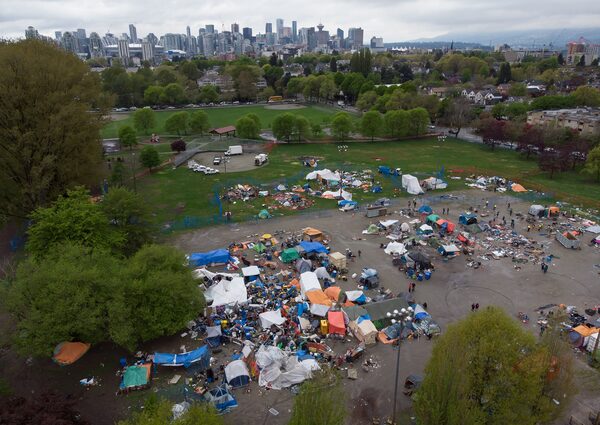 Tents and other structures are seen at a homeless encampment at Strathcona Park in Vancouver on April 30, 2021.DARRYL DYCK/The Canadian Press
