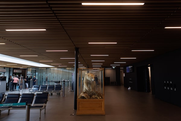 A stuffed spirit bear greets outgoing passengers at the small airport in Terrace, B.C. It’s the closest I’ve come to one during my visit. It’s beautiful and disarming, and seems to hold the whole departures lounge in its dizzying orbit.