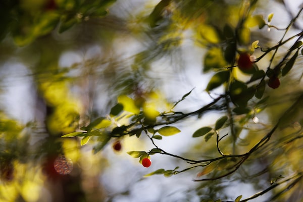 A cluster of red huckleberries grows on Campania Island. These berries are a favourite of bears in the area, who gorge themselves on them in late summer.
