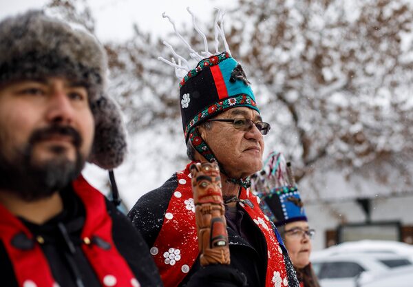 Wet'suwet'en Hereditary Chiefs from left, Rob Alfred, John Ridsdale, centre and Antoinette Austin who oppose the Costal Gaslink pipeline take part in a rally in Smithers B.C., on Friday January 10, 2020.JASON FRANSON/The Canadian Press