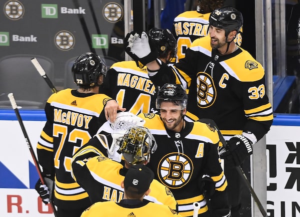 Boston Bruins defenceman Zdeno Chara, right, celebrates with teammates after eliminating the Carolina Hurricanes on Aug. 19, 2020.Nathan Denette/The Canadian Press