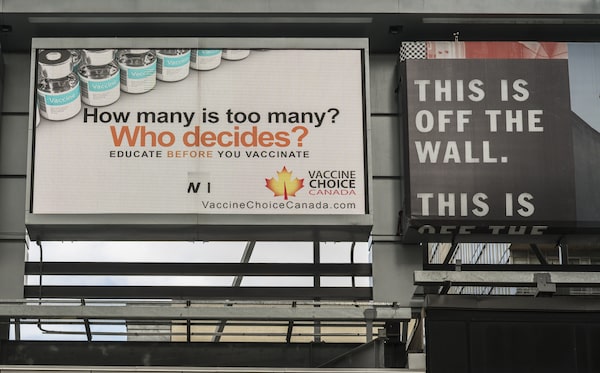 The billboards, posted by anti-vaccine group Vaccine Choice Canada, suggest vaccines are risky and that children don’t need to be immunized to attend school. Vaccine Choice Canada did not respond to a request for comment.