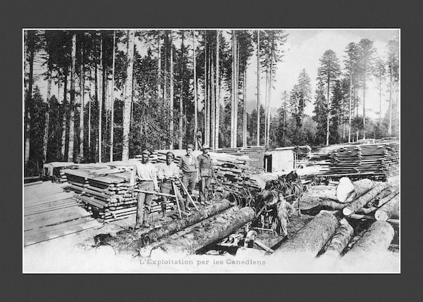 At the timber yard in La Joux, France, circa 1918. The black soldiers of No. 2 Construction Company worked alongside their white compatriots at La Joux, as illustrated in this photo.Courtesy of the Army Museum Halifax Citadel