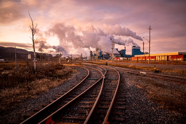 Steam hangs over the train tracks away from the Bombardier plant toward the Resolute Mill factory.