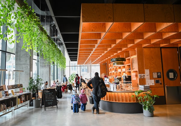 But the kids get to play, too. In the children’s section of the library, turquoise bookcases snake across the floor, subtly signalling to littles that they are welcome. A play area features bulbous rubber mounds; during my visit, some toddlers were wheeling toys up and down the slopes.