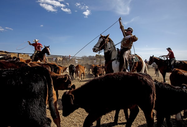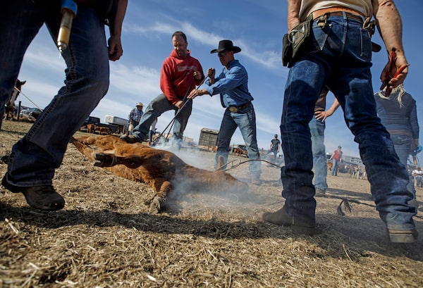 Riders rope calves for branding at the Westman farm in Alberta in May. Branding is used to identify livestock and prevent cattle rustling. At the corral, riders rope the calves for branding.JASON FRANSON/The Globe and Mail