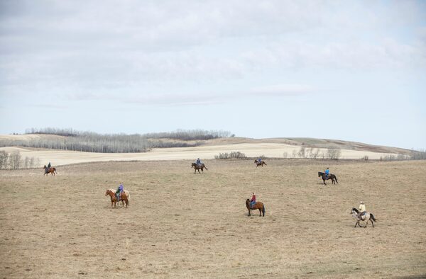 The riders spread out to begin driving cattle to the corral. Doug Westman has explained to them in advance what the pasture’s terrain is like.JASON FRANSON/The Globe and Mail
