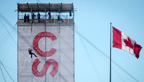 July 8, 2018: At the Calgary Stampede, a visitor slides down a zipline from a structure branded with the ‘C over lazy S’ logo.Jeff McIntosh/The Canadian Press