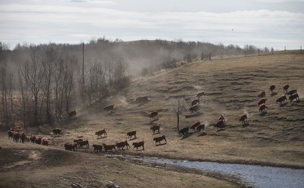 Dust blows as the cattle move down the hill.JASON FRANSON/The Globe and Mail