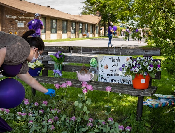 A woman lays a flower to honour victims of COVID-19 at an SEIU healthcare event outside Orchard Villa retirement home on June 1, 2020. The Pickering long term care home is one of the hardest hit in the pandemic with over 70 resident deaths.Melissa Tait/The Globe and Mail