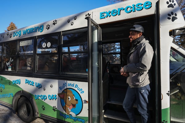 Denzel Morrison is not your typical dog walker – it’s obvious from the moment he arrives to pick up a client’s pup. Mr. Morrison is behind the wheel of a school bus painted white and blue with a picture of a smiling cartoon dog by the door, black paw prints scattered all over it. It’s the bus he uses to shuttle pooches to private dog parks in Calgary.