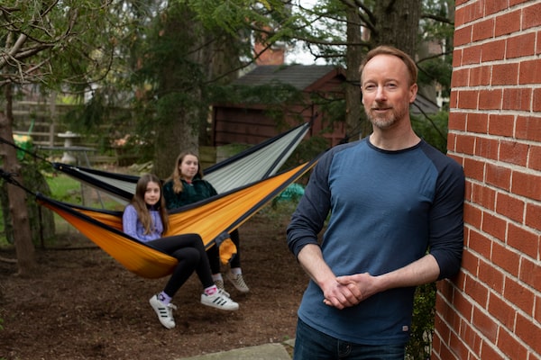Troy Glover and his daughters at their Kitchener, Ont., home on April 14, 2020. Barring a surge in new COVID-19 cases, it’s likely that fragments of summer will happen in some places – just not for everyone equally, Glover, chair of the Department of Recreation & Leisure Studies at the University of Waterloo, says.Fred Lum/The Globe and Mail