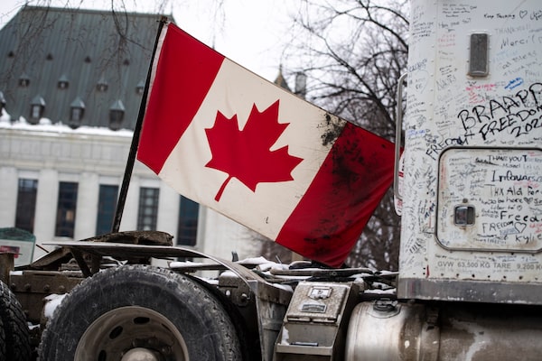 A truck, part of a convoy opposed to COVID-19 mandates, is parked outside the Supreme Court building on Feb. 6.Justin Tang/The Canadian Press