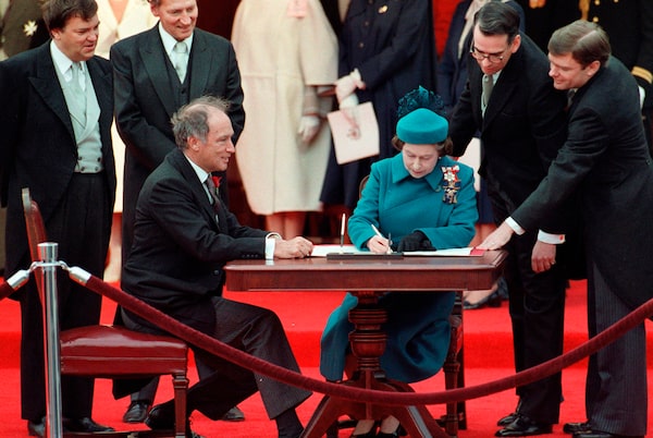 The Queen signs Canada's Constitution in Ottawa on April 17, 1982, as prime minister Pierre Trudeau looks on. This was the ceremony that took Canada's founding document out of the British Parliament and into the Canadian one.Ron Poling/The Canadian Press