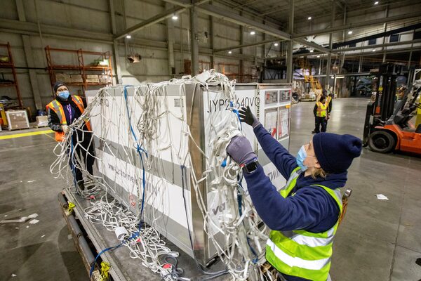 FedEx employees unload a shipment containing doses of the Moderna vaccine at Toronto Pearson Airport in Mississauga, Ont., on March 24.CARLOS OSORIO/Reuters