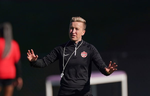 Three Canada Soccer officials, including head coach Bev Priestman, were sent home from the Games in July, after French police tracked a drone hovering over the practice of the New Zealand women’s team. Priestman gestures during a soccer training session ahead of the FIFA Women's World Cup in Melbourne, Australia, July 17, 2023.Scott Barbour/The Associated Press