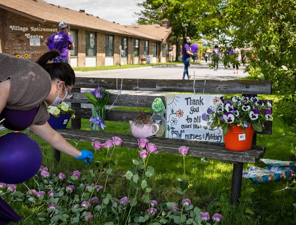 A woman lays a flower at an event honouring those who died from COVID- outside Orchard Villa retirement home in Pickering, Ont., on June 1, 2020.Melissa Tait/The Globe and Mail