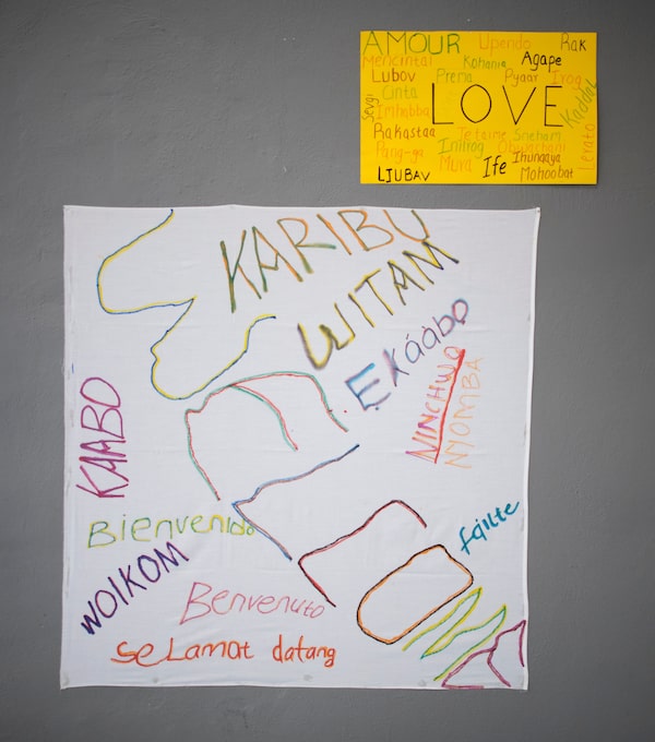 Signs at Drummond Hill Presbyterian Church translate 'welcome' and 'love' into myriad languages. The church does what it can to help newcomers in the city.