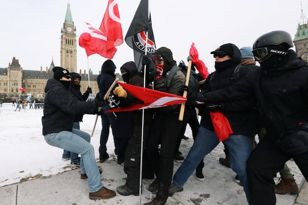A far-right protester clashes with counter-protesters during a far-right rally on Parliament Hill.CHRIS WATTIE/Reuters