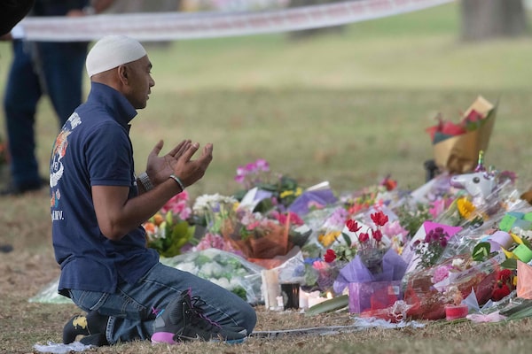 A man kneels facing the Masjid Al Noor mosque on March 19, 2019 in Christchurch, New Zealand.MARTY MELVILLE/AFP/Getty Images