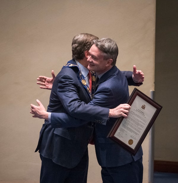 Toronto Mayor John Tory embraces Councillor Gord Perks at a 2018 oath ceremony after an election where city council was greatly reduced by order of the province of Ontario.Fred Lum/The Globe and Mail