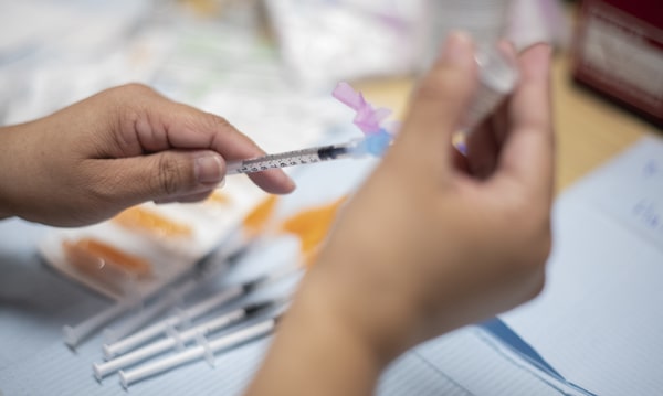 Toronto Public Health nurse draws a dose of Moderna into a syringe at a Toronto vaccination clinic on Feb 3, 2022.Fred Lum/the Globe and Mail